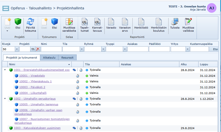 Suorat linkit projekti- ja työnumerolistauksiin sekä resurssienhallintaan ovat päävalikossa projektinhallinnan alivalikossa. Myös tältä etusivulta pääsee listauksiin työkalupalkin Etsi -painikkeista.