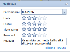 Projektin toimittajat voi arvioida seuraavilla ominaisuuksilla: Hinta, Laatu, Tieto-taito ja Resurssit.