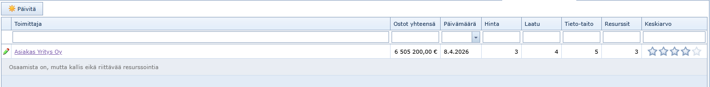 Toimittajaluettelo päivitetään painamalla Päivitä-nappia. Se summaa ostojen nettohinnat toimittajittain ja lisää uudet toimittajat arviointilistaan.