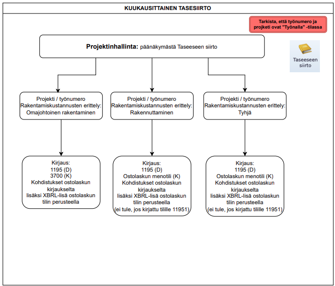 Kuukauden aikana tehdyt investointikirjaukset siirretään kuukausittain taseelle "Taseeseen siirto" toiminnallisuudella, joka löytyy projektinhallinnasta Projektinhallinnan pääsivulta tai yksittäiseltä projektilta.
