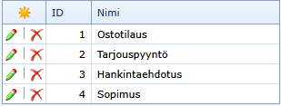 - Tarjouspyyntö: Tarjouspyynnölle lisätyt nimikkeet eivät aiheuta varastotapahtumia eikä niitä voi vastaanottaa. Tarjousten käsittely päättyy joko hyväksyntään tai hylkäykseen. Hyväksytyistä tarjouspyynnöistä luodaan automaattisesti vastaava ostotilaus.