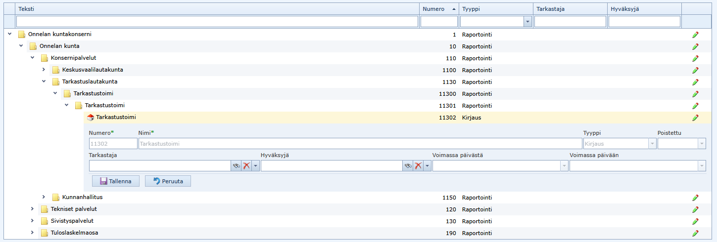Tyyppi: Kustannuspaikkarakenne koostuu Raportointi- ja Kirjaustasoista. Raportointitasot ovat kansioita ja kirjaustasot kustannuspaikkoja. Raportoida voi molemmilta tasoilta, mutta tietueita voi kohdistaa vain kirjaustasoille.