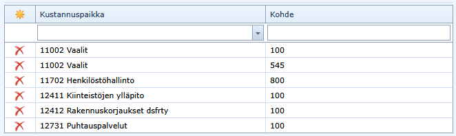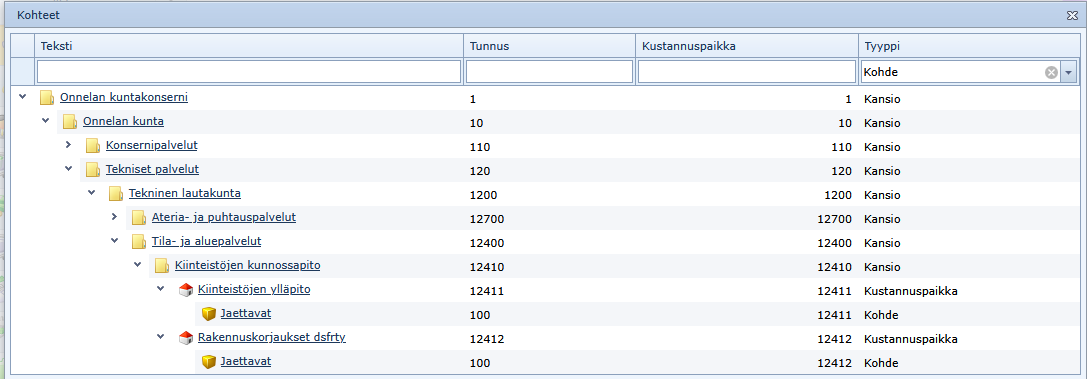 Puurakenne näyttää kohdistusten jälkeen seuraavalta. Saman kohteen voi kohdistaa usealle eri kustannuspaikalle.