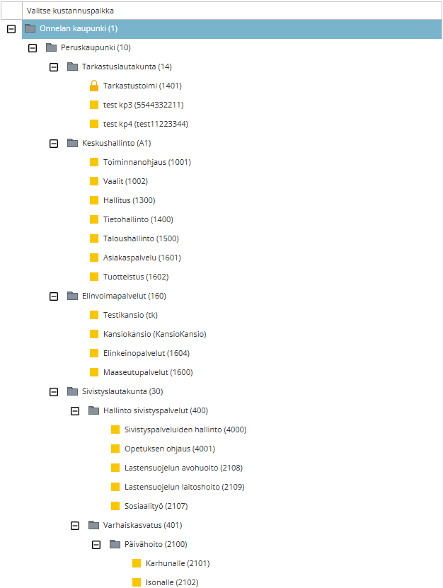 Rakenteessa keltaisella laatikolla oleva rivi vastaa budjetoitavaa kustannuspaikkaa.