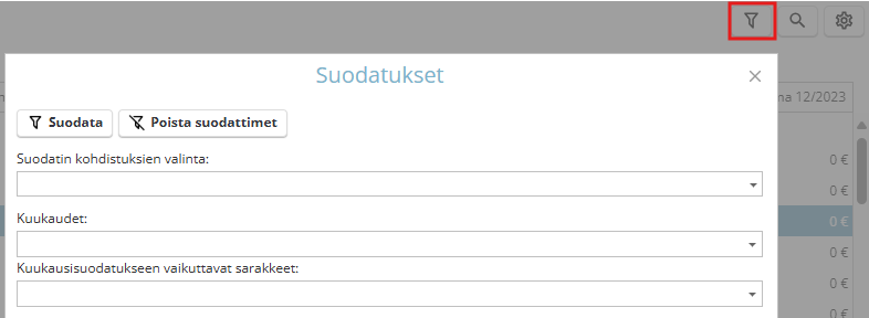 Suodatukset valikossa voidaan rajata eurotietoja eri tunnisteiden perusteella