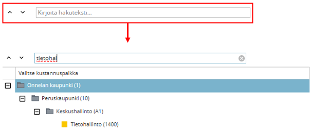 Organisaatiorakenteen ollessa laaja, voi oikean kustannuspaikan löytymistä nopeuttaa hakemalla sitä nimellä, nimen osalla tai koodilla organisaatiorakenteen yläpuolella olevasta ”Kirjoita hakuteksti” kohtaan ja painamalla Enter.