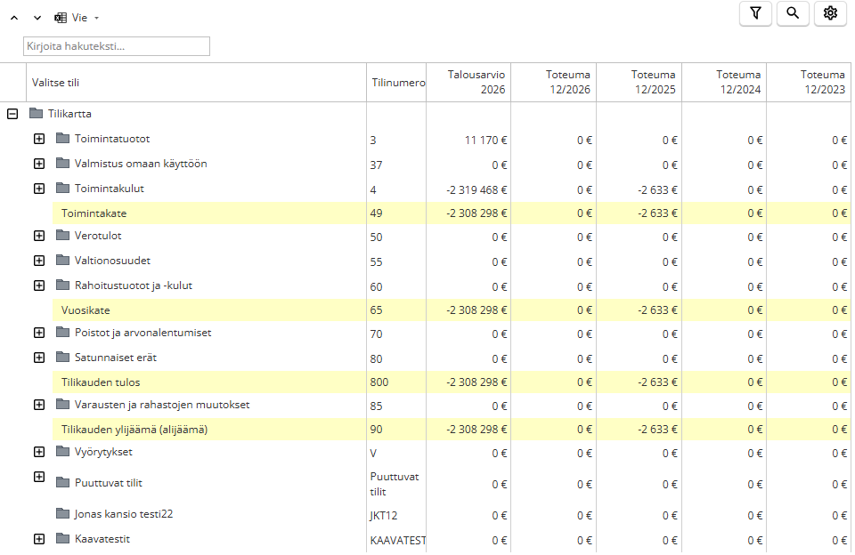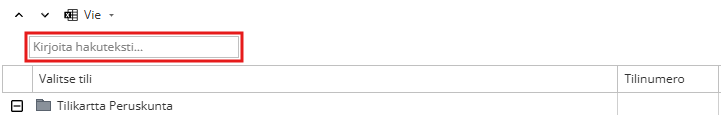 Kuten organisaatiorakenteen osalta, myös tilikartassa on haku toiminnallisuus, joka löytyy tilikartan yläpuolelta. Tilikarttaa voidaan suodattaa joko tilin nimen, tilinumeron tai talousarvio summan mukaan.