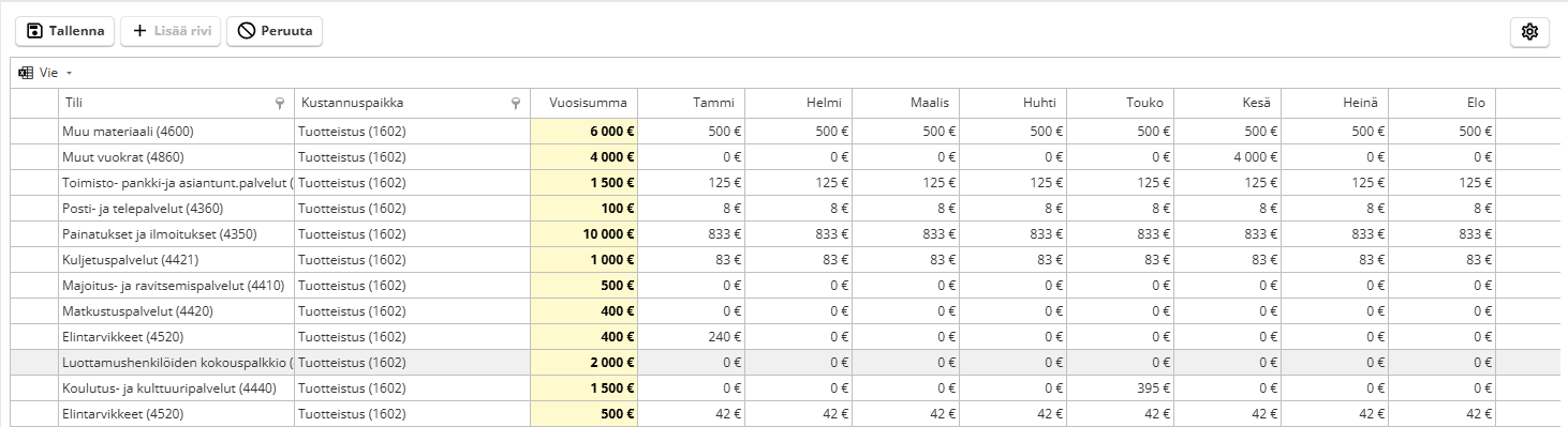 Budjettikirjausnäkymä. Klikkaa suuremmaksi.