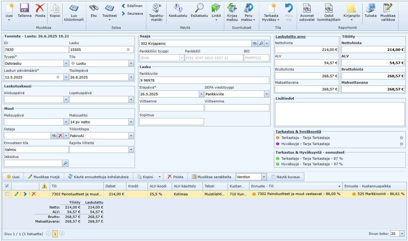 Ostolasku, jota ei voida tiliöidä sopimukseen tai tiliöintimalliin perustuen, voidaan tiliöidä FabricAI:n ennusteella.